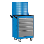 4 ящика и перфорированный экран. Нагрузка на тележку 220кг. Корпус тележки сварной. Тележка оснащена системой антиопрокидывания новой конструкции, которая блокирует открывание ящиков. На боковых стенках корпуса выполнена квадратная перфорация для установки крючков, держателей и других аксессуаров. Ящики на шариковых телескопических направляющих полного выдвижения. Обеспечен свободный и плавный ход ящиков даже при полной загрузке. Габаритные размеры тележки с учетом колес, лотка и ручки (ВхШхГ), не более: 950x780x490 мм. Вес: 50,2 кг.