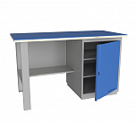 Однотумбовый. Допустимая нагрузка на столешницу 750 кг. Опорные элементы выполнены сварными из холоднокатаной стали. Верстак состоит из опоры, тумбы P7 с дверью и двумя полками и полки-стенки. Все металлические элементы покрыты полиэфирной порошковой краской. Столешница состоит из фанеры марки ФСФ толщиной 24 мм, которая покрыта лаком-антисептиком и листом оцинкованной холоднокатаной стали толщиной 1,2 мм. Размеры (ВхШхГ) 855x1196x696 мм.