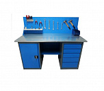 Двухтумбовый. Допустимая нагрузка на столешницу 1000 кг. Опорные элементы выполнены сварными из холоднокатаной стали. Для выполнения сборочных, ремонтных, слесарных, монтажных и других видов работ на производстве, в сервисных центрах, мастерских, гаражах, а также для обучения технологии в учебных заведениях. Комплектуется полкой-стенкой, расположенной под столешницей для удобного размещения габаритного инструмента и оснастки. Размеры верстака: 855x1596x696 мм. Вес: 107 кг. Поставляется в 4 комплектациях на выбор.