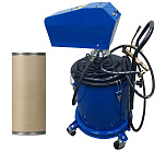 Нагнетатель пневматический, для густой смазки. Комплект оснащен тележкой для бочек 20-60 кг., пневматический насос для смазки 50:1 производительностью 800гр/мин, мембрана и крышка для солидолонагнетателя, шланг 4 м, раздаточный пистолет с наконечником. При давлении воздуха 6-8 Атм давление смазки 400 Атм максимально. Колёса: 2 прямых. Масса: 16 кг.