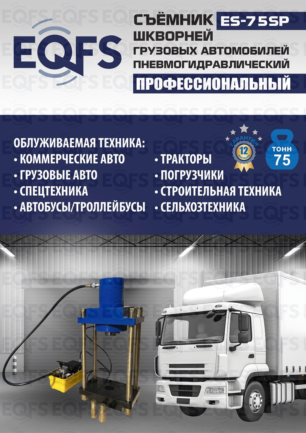 Позволяет работать под разными углами. Сокращает время ремонта. Для выпрессовки шкворней из поворотной цапфы погрузчиков, тракторов, строительной техники, коммерческих и грузовых авто отечественного и импортного производства: MAN, MERCEDES, SCANIA, VOLVO, Корейские и Китайские авто. Пневмогидравлический привод. Рабочее окно 400x320 мм. Усилие 75 тонн.