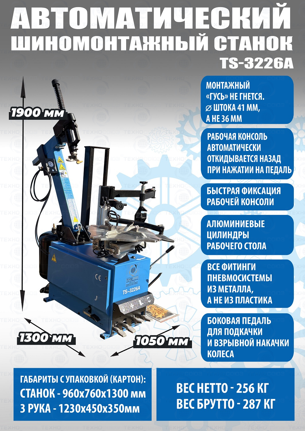 Автоматического шиномонтажного стенда TS-3226А предназначен для монтажа и демонтажа шин легковых автомобилей, внедорожников и легких грузовиков с размером колес 11-24 дюйма. Усилие пневмоцилиндра в 2500 кг. В комплекте: полноценная 3-й рука для работы с жесткой и низкопрофильной резиной RUNFLAT. + встроенный бустер 24 литра (взрывная подкачка) + пистолет для подкачки шин + монтажка + регулятор давления с влагоотделителем и манометром.