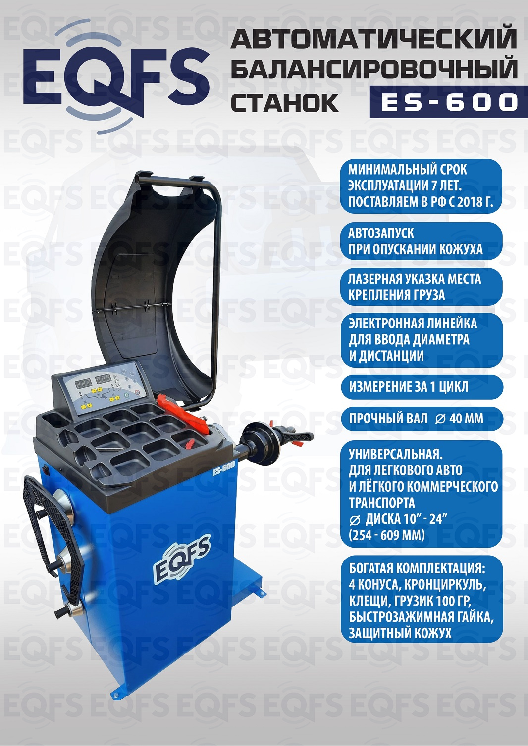 + ES-600 Балансировочный станок. Автомат. Для колес с диаметром диска с резиной до 800 мм. Размеры диска: ширина 3–10” (76-254 мм), диаметр диска 10–24” (254÷609 мм). Вал- 40мм. Гарантия 18 мес – наш монтаж, 12 мес – самостоятельная установка. В комплекте: кожух с автозапуском + клещи + кронциркуль + быстрозажимная гайка + набор конусов.