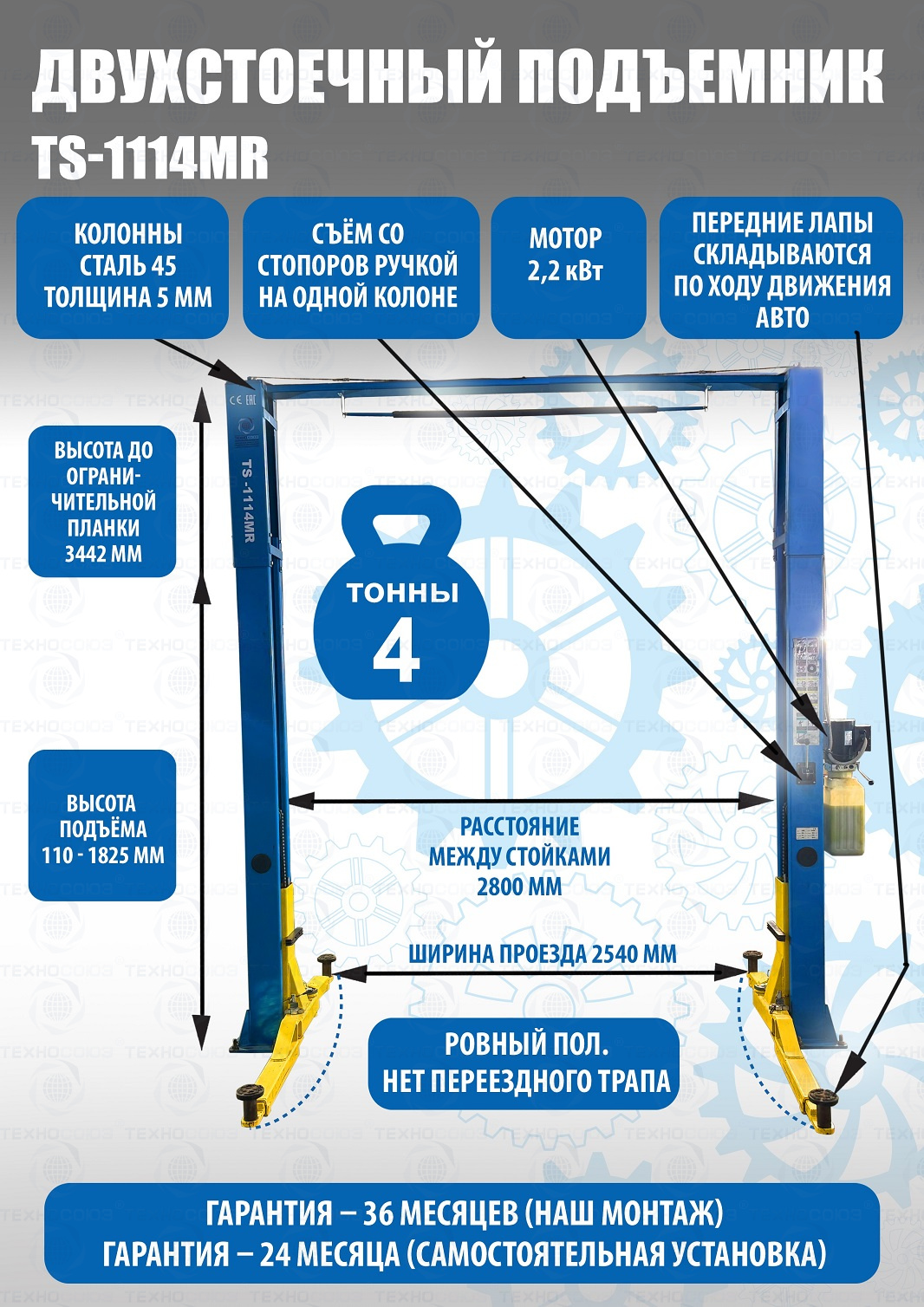 ·         В случае ввода в эксплуатацию подъемника специалистами нашей технической службы гарантия увеличивается до 36 месяцев. При условии прохождения ежегодного технического обслуживания сервисной службой ООО "ТЕХНОСОЮЗ" или уполномоченными дилерами.