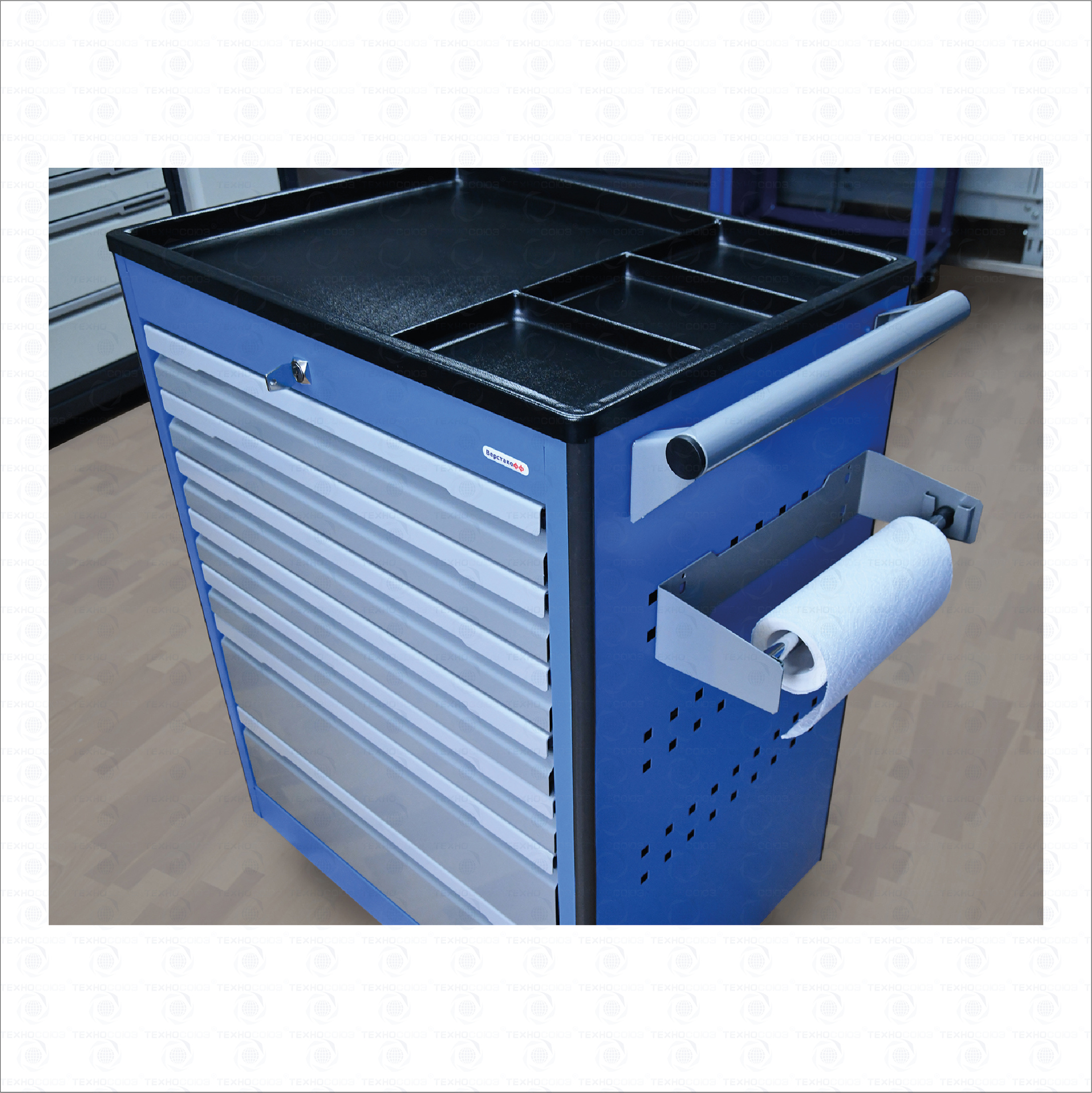 Тележка с 4 выдвижными ящиками предназначена для хранения и транспортировки к рабочему месту инструментов, приборов и другой оснастки, необходимых для работы на сервисных и слесарных участках, а также в цехах заводов и на промышленных предприятиях.Корпус тележки сварной. На боковых стенках корпуса выполнена квадратная перфорация 12х12 мм с шагом 38 мм для установки крючков, держателей и других аксессуаров.