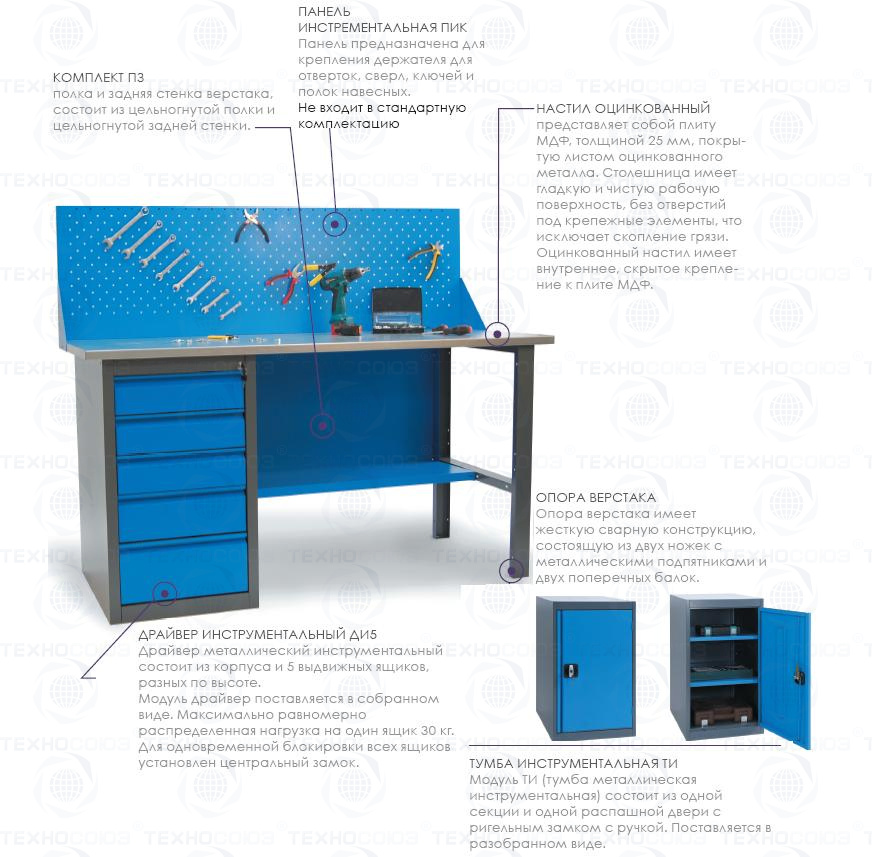 - Верстак имеет надежную модульную конструкцию с усиленной столешницей (плита МДФ 25мм, покрытая листом оцинкованного металла).